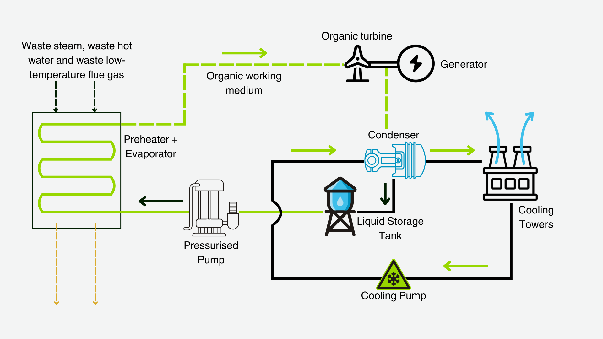 The MagLev ORC Power Generator uses waste heat source such as steam or flue gas to heat a working fluid in an evaporator. The fluid evaporates and drives a frictionless, high-speed turbine — up to 48,000RPM — to generate on-site or grid-safe power. The system cools the vapour back into liquid form, creating a closed-loop cycle.